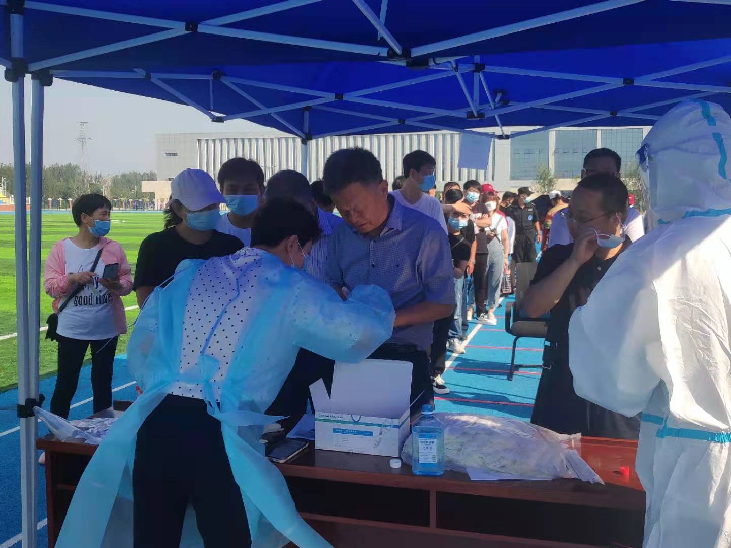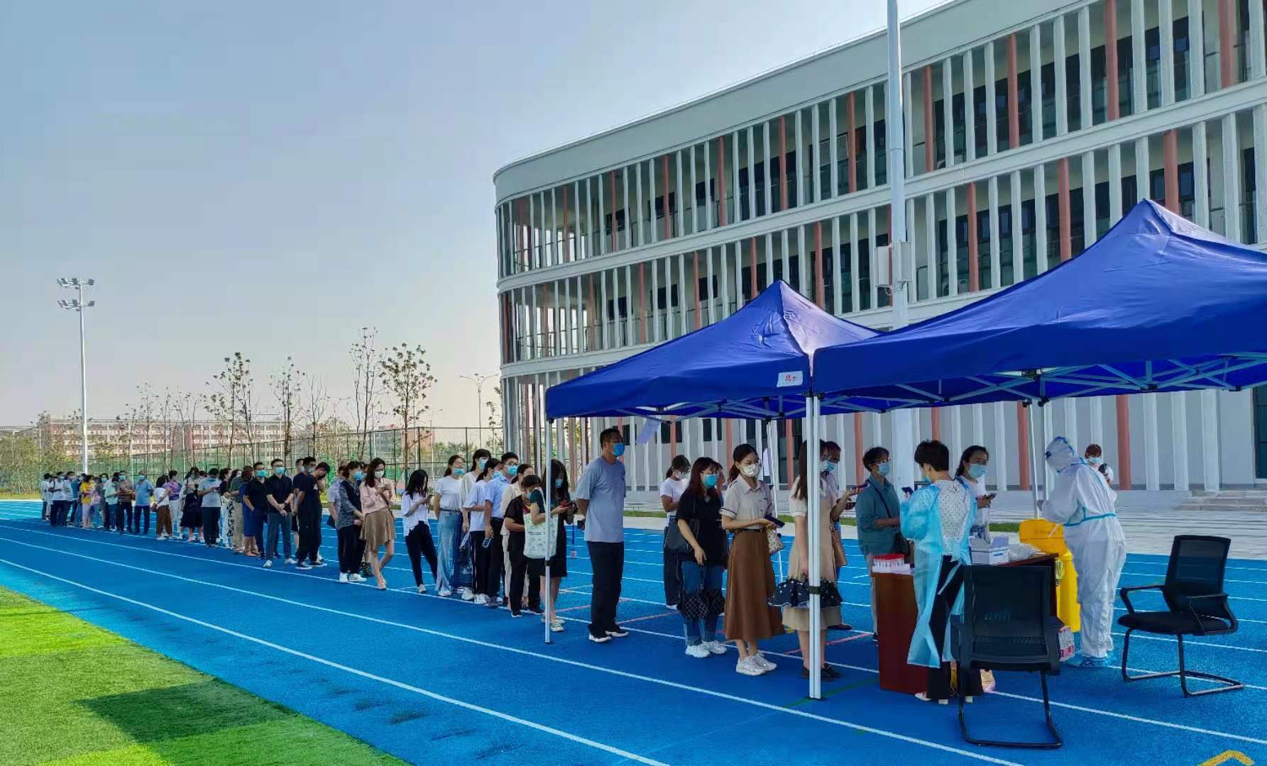 现场,人员繁多,教职工们积极配合医护人员,整个现场井然有序使得检测工作圆满完成。我校将积极配合疫情防控工作,一如既往做好各项防疫措施,与全校师生一同筑起抗疫保护墙。