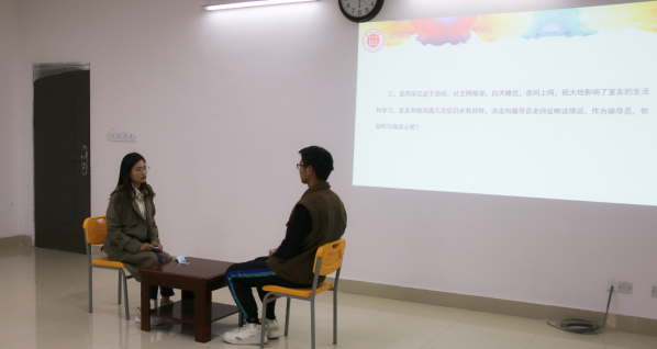 本次辅导员素质能力大赛分为基础知识测试、班情校规熟知、主题班会、案例分析、谈心谈话五个项目。上午进行了基础知识测试、班情校规熟知两个项目,下午进行了案例分析、和谈心谈话两个项目,主题班会以视频录像方式进行。