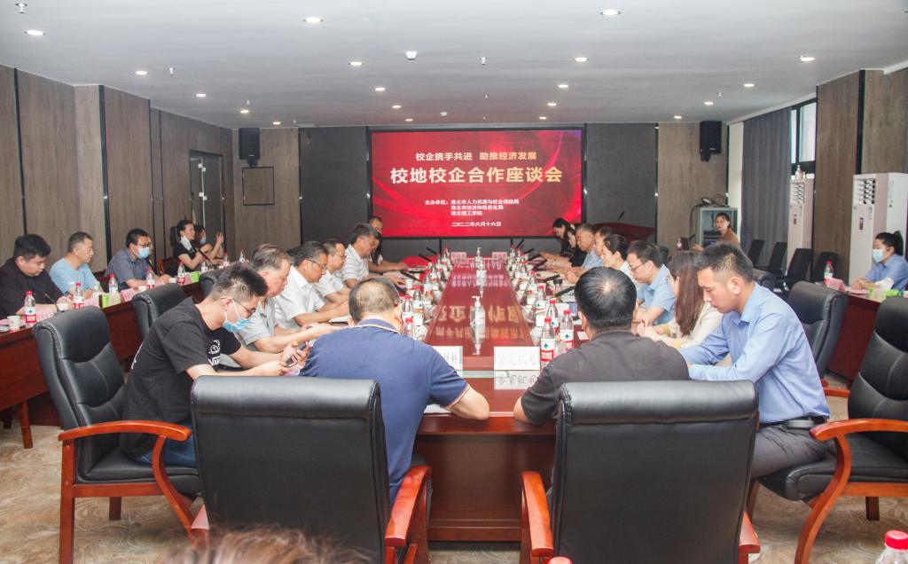 为促进校地校企合作,提高人才培养质量,6月16日上午,淮北理工学院联合淮北市人力资源与社会保障局、淮北市经济与信息化局,在学校艺术楼二楼205会议室召开校地校企合作座谈会。淮北市人力资源与社会保障局副局长张华,市公共就业与人才中心主任陈龙忠、副主任张洁洁;市经济和信息化局总工程师张锦、民营办副主任谢寒以及22家企业代表参与本次座谈会,学校董事长查东辉、校长杨兵、党委书记朱德顺、副校长王义宁、汪建利、郑来纪及相关部门、二级学院负责人参加了座谈会。座谈会由张锦主持。