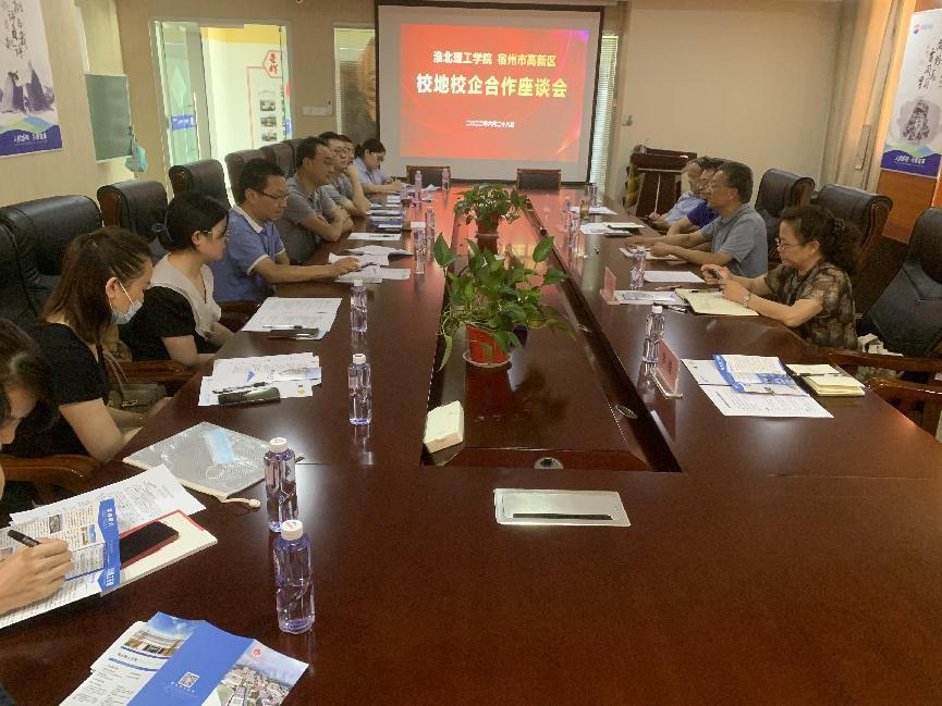 在随后的校地校企座谈交流会上,高新区就业办主任巨松首先对朱德顺一行的到来表示热烈欢迎,随后介绍了宿州高新区的发展现状、未来规划、人才需求情况以及校企合作现状。座谈会由吕晓明主持。