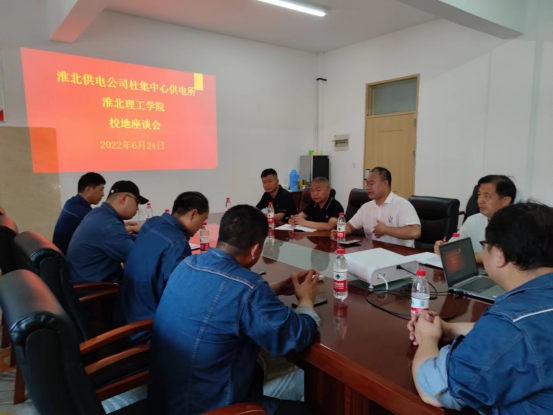 6月24日下午,淮北供电公司杜集中心供电所王雨浩所长一行5人到我校座谈交流,学校副校长郑来纪出席座谈会。后勤保卫处处长程坚,副处长王本新,基建处副处长黄圻同志参加会议。