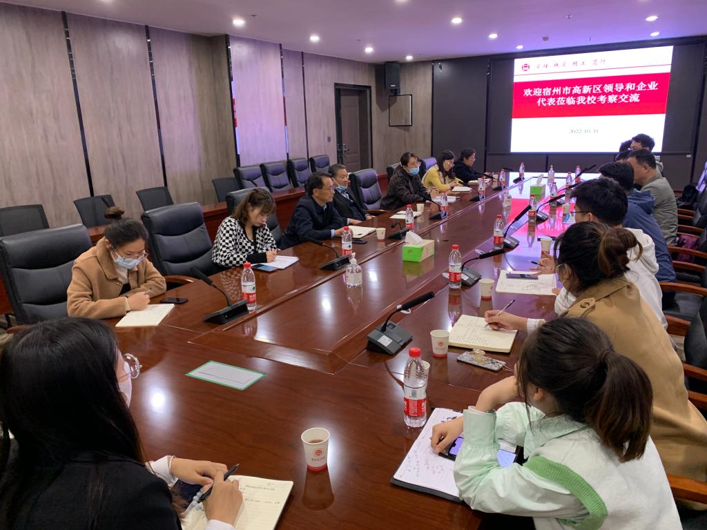 2022年10月31日下午,宿州市高新技术开发区就业办副主任吕晓明和企业代表来我校洽谈校企合作事宜。校党委书记、督导专员朱德顺、学生处(就业处)处长孙增响、就业科工作人员及2023届毕业班辅导员参加交流活动。
