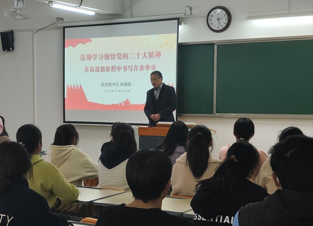 2022年11月23日下午,学校督导专员、党委书记朱德顺在学校第二教学楼322教室为2022级经济学普本学生讲授以“深刻领悟党的二十大精神,在奋进新征程中书写青春华章”为主题的思想政治课。