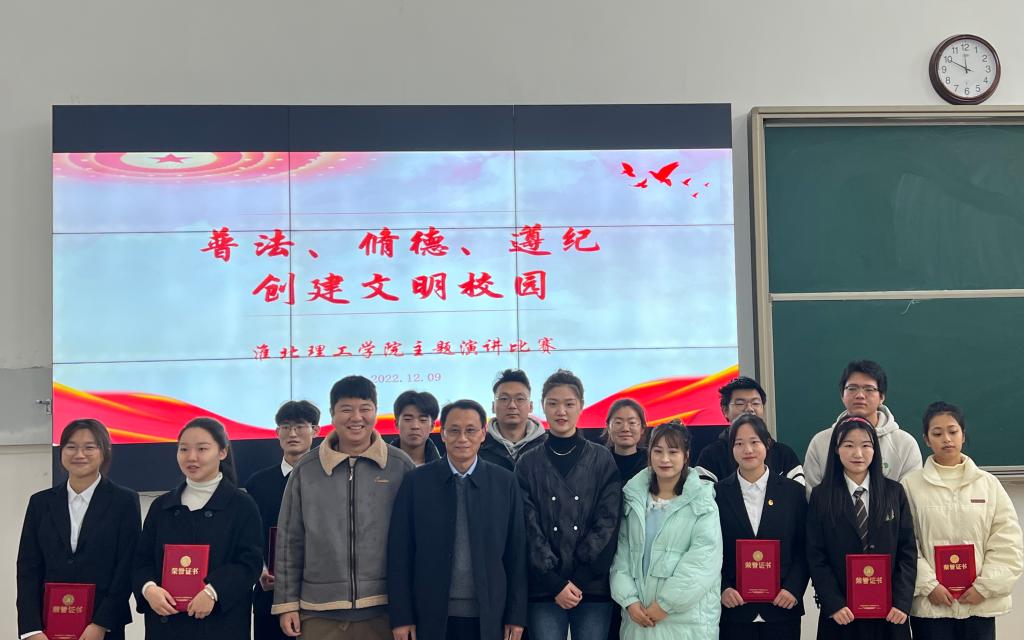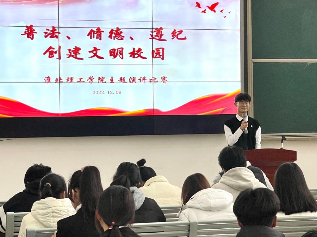 孙增响开场致辞。他表示此次演讲比赛旨在提升同学们的法律意识、纪律意识以及德育观念,也是淮北理工学院“普法、修德、遵纪,创建文明校园”专项活动的成果展示。希望同学们能增强法治观念,弘扬以德服人、以礼待人、遵守校纪校规的文明思想,成为懂法明理、修德遵纪的新时代大学生。