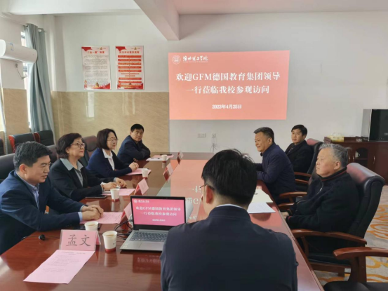 杨兵向客人详细介绍了学校的创办历程、发展规划、教育教学、专业设置、人才培养等方面的情况。袁玮介绍了GFM德国教育集团近年的发展及目前在各地进行的合作业务领域、项目情况,表示双方今后在深化校企合作方面空间广阔。赵明介绍了淮北高新技术园区企业相关情况,并希望与我校进一步加强交流合作,整合优势资源,实现合作共赢。