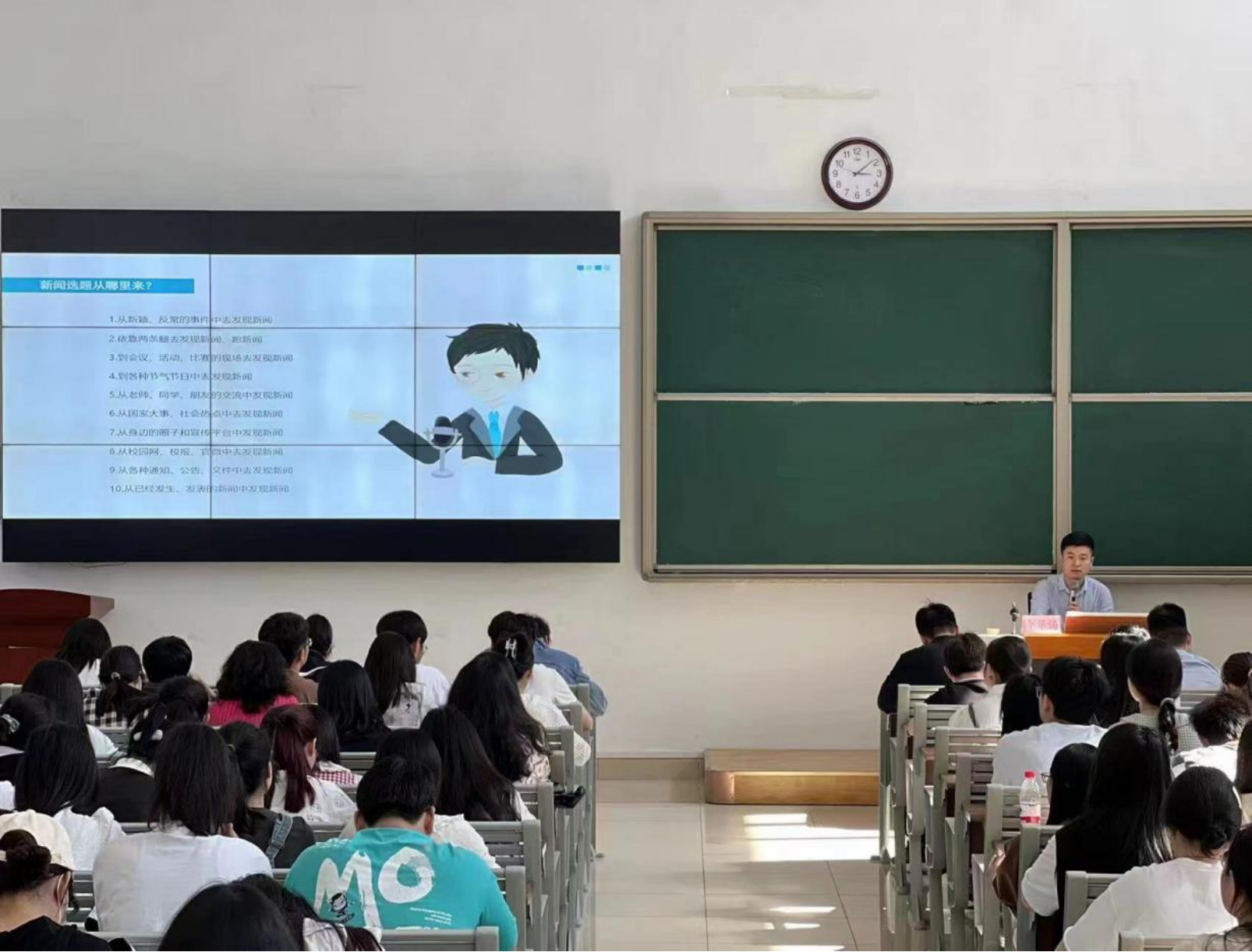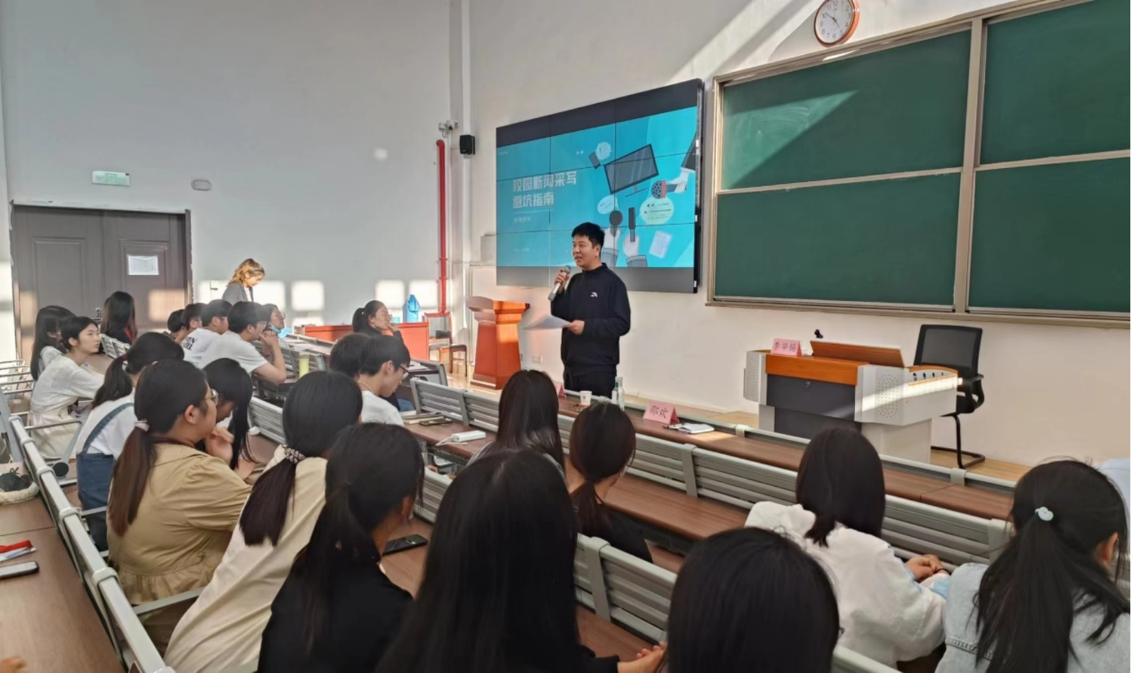 5月14日,为培养各部门学生骨干的新闻写作能力,促进学生全方面发展,校团委在一教121教室举办“新闻写作与新媒体技能培训”讲座,中国青年网青年发展服务中心主编李华锡为学校师生分享新闻写作经验。校团委书记刘帅克、各二级学院团总支书记、辅导员代表,校学生会、学社联及各二级学院学生会100余人参加了培训。
