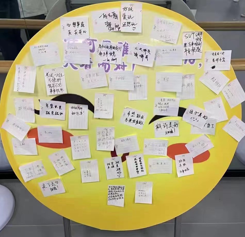 在“扔掉标签”活动中,成员们一一写出自己的压力和烦恼,在团体合力下将其全部“丢掉”,用美好的理想和祝愿替代,一起畅谈人生的观点和看法。活动时间总是短暂的,但伴随着美妙的音乐,成员们逐个贴上自己的心愿,合影留念,为此次团体活动画上了圆满的句号。