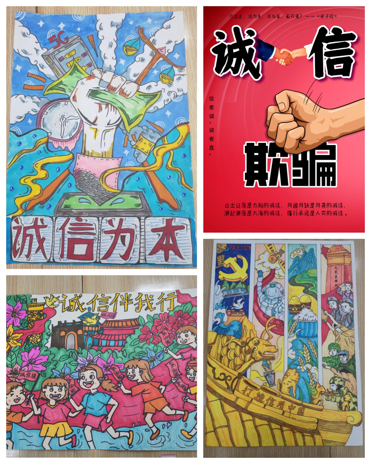 本次诚信文艺作品展,以征集原创作品的形式,展示了同学们的价值理念和艺术感悟。如手绘海报作品《诚信为本》展示大数据时代互联网并非法外之地,提醒大家做一个以诚信为本、合格守法的网民。电子海报作品《诚信共赢,打击欺骗》以诚信握手、重锤出击打击欺骗为主图,显示着诚信的地位。《诚信伴我行》呼吁我们作为新一代的大学生一起做诚信青年,一起扬起诚信的旗帜;《构建诚信社会,打造信用中国》从历史角度、社会发展角度以及经济角度闸述了信用的重要性。