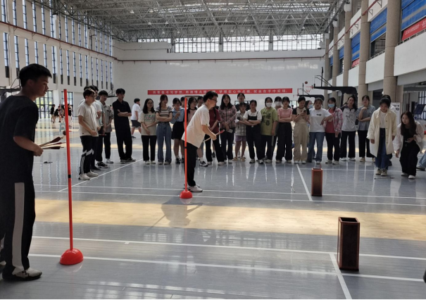 活动初始,参赛学生6人一组、分成十组,并讲解活动规则。随后,开始第一项活动——趣味投壶。让各组员先转圈后进行投壶并交替进行,用时最短的小组获胜。本项活动培养了大学生团结合作精神,提高了大学生的心理素质。