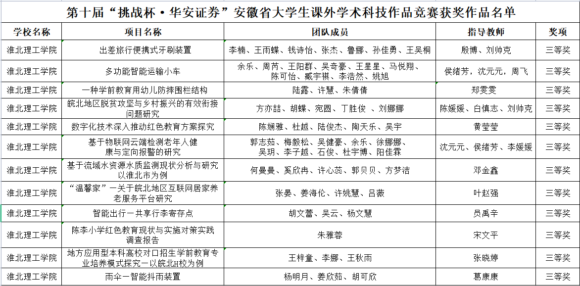为深入学习贯彻党的二十大精神,进一步引导青年学生努力培养科学精神和科学态度,积极学习科学知识和科学方法,由团省委、省教育厅、省科协、省社科院、省学联共同主办,安徽理工大学承办的第十届“挑战杯”安徽省大学生课外学术科技作品竞赛顺利落下帷幕。我校共有12件参赛作品获得安徽省三等奖。