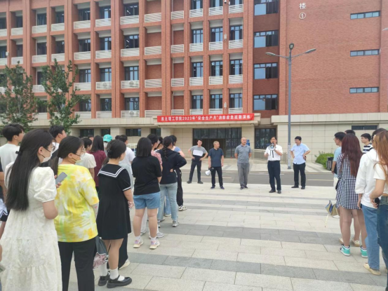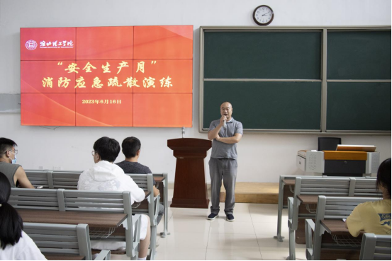 6月16日下午,我校在教一121教室举行消防应急疏散演练,学校副校长郑来纪、后勤保卫处、学生处等部门负责人、各二级学院书记助理及师生代表约200人参加演练。