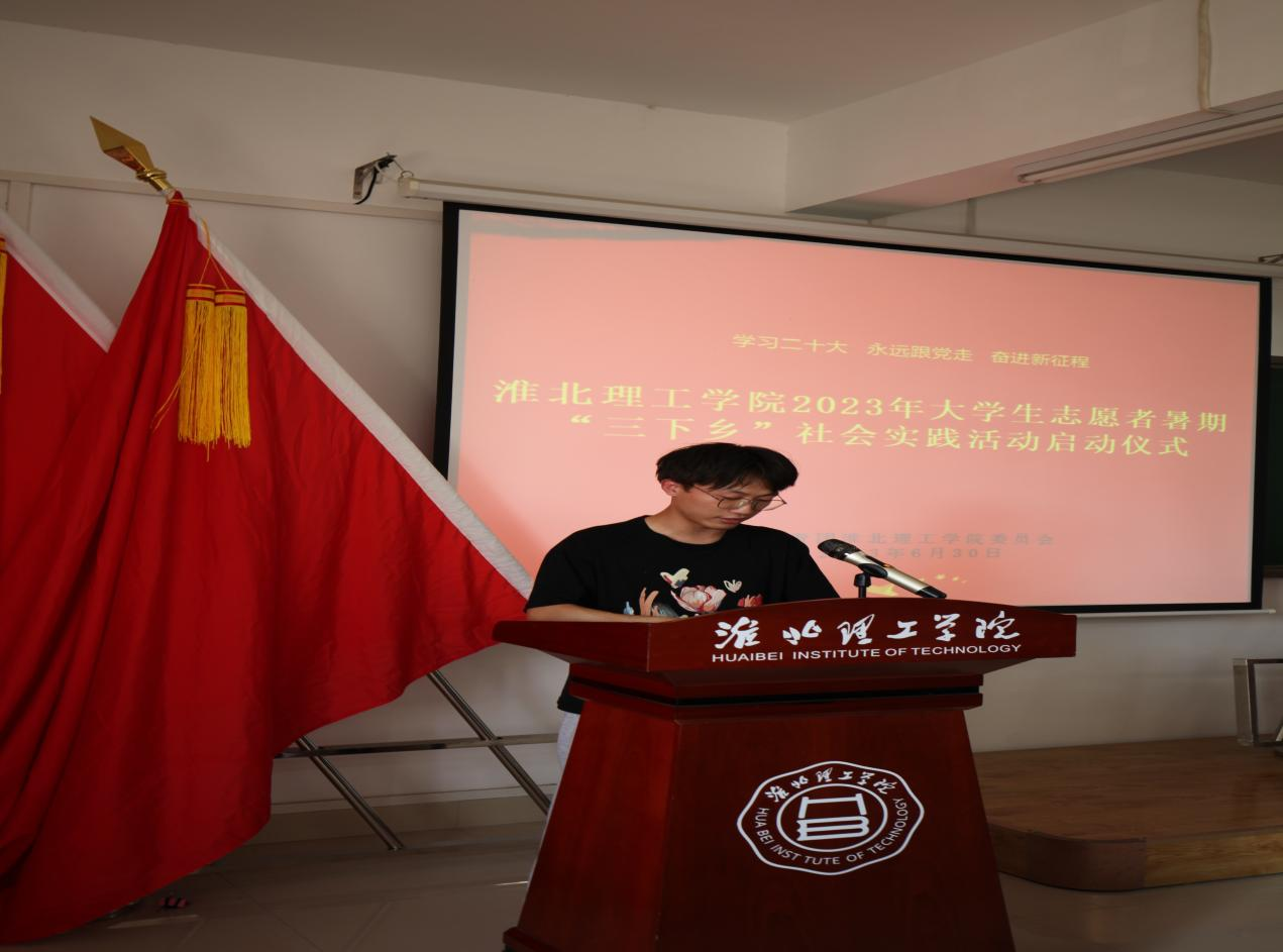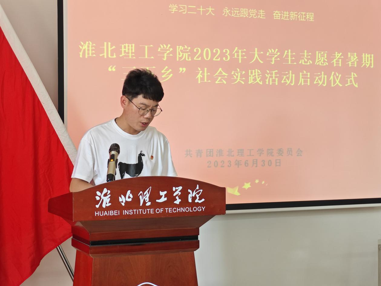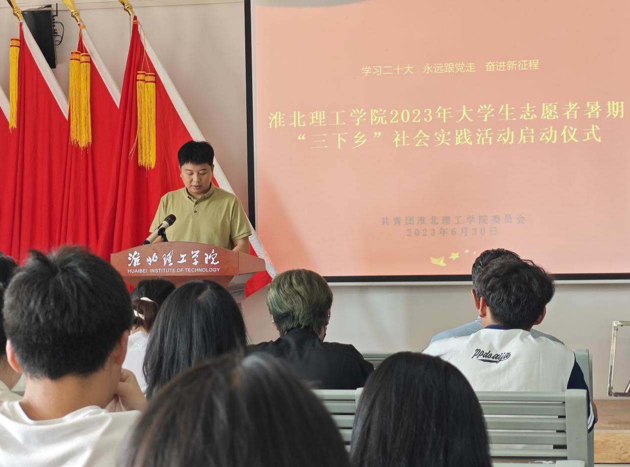 校团委书记刘帅克对2023年暑期“三下乡”社会实践活动进行安排部署,要求各团队在社会实践活动中树立淮北理工学院学子的良好形象。“三下乡”暑期社会实践团队指导教师代表叶赵强希望各团队要珍惜“三下乡”社会实践的机会,发扬不甘示弱的精神,通过扎实的社会实践来了解国情,增强才干。学生代表吴浩松表示将贯彻淮北理工学院校训精神,发扬不怕苦、不怕累的精神,积极投身于2023年暑期“三下乡”社会实践活动。