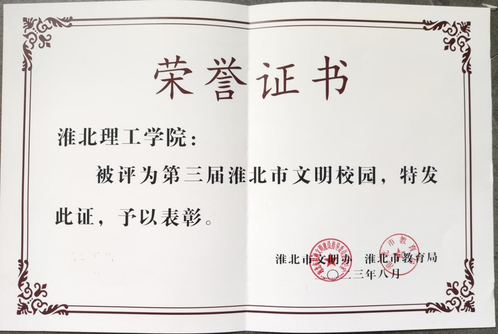 在淮北市委宣传部,淮北市精神文明建设指导委员会办公室、淮北市教育局大力支持下,在学校文明校园创建工作领导小组和全校师生员工的共同努力下,经过文明校园申报、考核组实地考察等环节,学校顺利通过各项审核,被授予“第三届淮北市文明校园”荣誉称号。