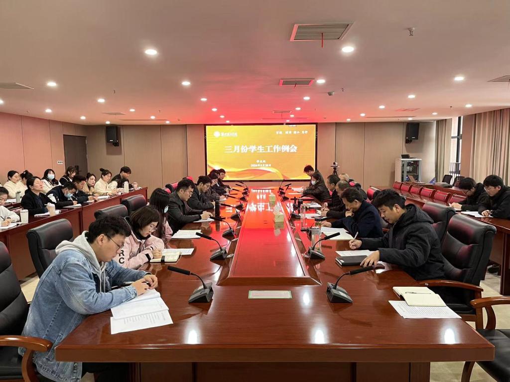 3月28日上午,我校在行政楼814会议室召开3月份学生工作例会,党委书记朱德顺、副校长郑来纪、学生处(团委)、后勤保卫处负责人、各二级学院党总支副书记、书记助理及全体辅导员参加会议。会议由朱德顺主持。