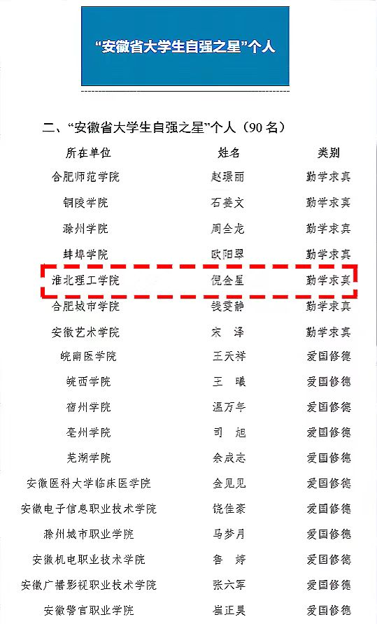 据悉,本次安徽省大学生自强之星评选活动,按照爱国修德、勤学求真、创新创业、社区实践、奋斗力行5个类别,经组委会组织专家评审,共计确定90名同学为“安徽省大学生自强之星”获得者。