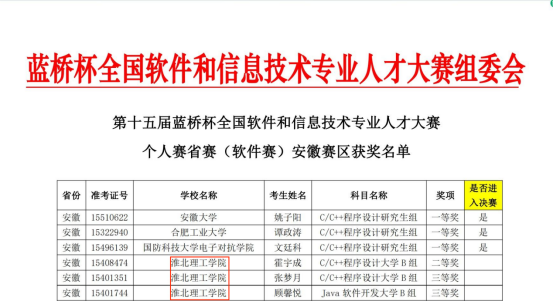 近日,第十五届蓝桥杯全国软件和信息技术专业人才大赛个人赛省赛安徽赛区圆满落幕。淮北理工学院电子与信息工程学院首次组织并筛选出17位学子参赛。其中4位参加软件赛的学子荣获省级大学B组二等奖1项和省级大学B组三等奖2项,13位参加电子赛的学子荣获省级大学生组二等奖1项和省级大学组三等奖5项。部分获奖名单如图所示: