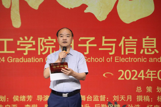 电子与信息工程学院院长、党总支书记朱昌杰在致辞中对2024届毕业生们顺利毕业表示祝贺,鼓励他们用青春去拼搏、去圆梦,勇攀高峰,创造更加辉煌的未来,并给予全体毕业生几点希望:希望毕业生要有人生的梦想;希望毕业生要有为实现梦想的担当;希望大家在青春之年实现自我梦想;希望大家用奋斗的青春,为我们国家的发展奉献自己的力量;希望大家永远记住淮北理工学院永远是你们的家,无论你们事业顺利还是暂时遇到挫折,希望你们常回母校和你的老师分享你们的喜悦、聊聊你们的酸甜苦辣,我们永远是相亲相知的一家人。今天你们以学校为荣,明天学校以你们为骄傲。