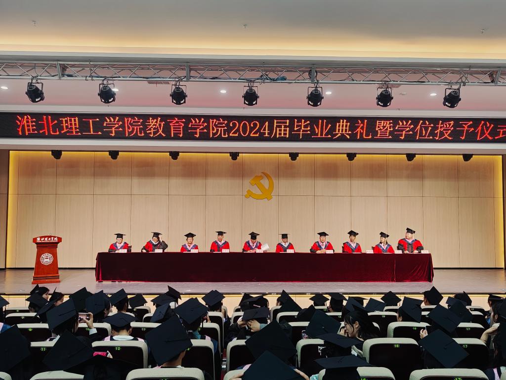 毕业典礼在雄壮的国歌声中拉开帷幕,谢贤德宣读《淮北理工学院2024届本科毕业生学士学位授予决定》后,出席仪式的领导和教研室主任分别为毕业生代表颁发学历、学位证书,并进行拨穗正冠与合影留念。