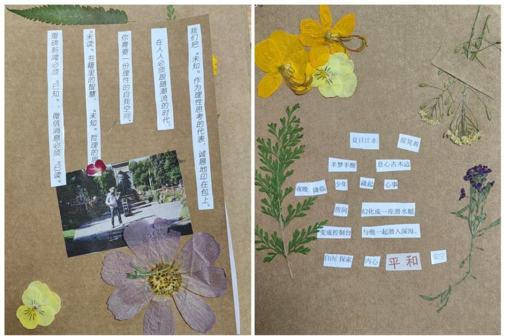 5月15日,为丰富校园文化生活,激发学生文学创作兴趣、让同学们在释放创意的过程中,感受诗歌的魅力,进而释放消极和不良情绪,我校于一教210、211教室成功举办了“以爱之名”拼贴诗、拼贴画团体辅导活动。同学们各自裁下素材,粘贴在美术纸上,以干花为材料装饰自己的作品,尽情地在作品中表达对生活的感悟和对未来的憧憬。