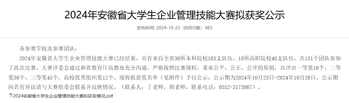 10月20日,由安徽省省教育厅主办,安徽财经大学承办的安徽省大学生企业管理技能大赛(2024)(B类)落下帷幕。我校经管学院三支代表学校参赛的队伍在本科组赛道上荣获两个二等奖和一个三等奖的好成绩。