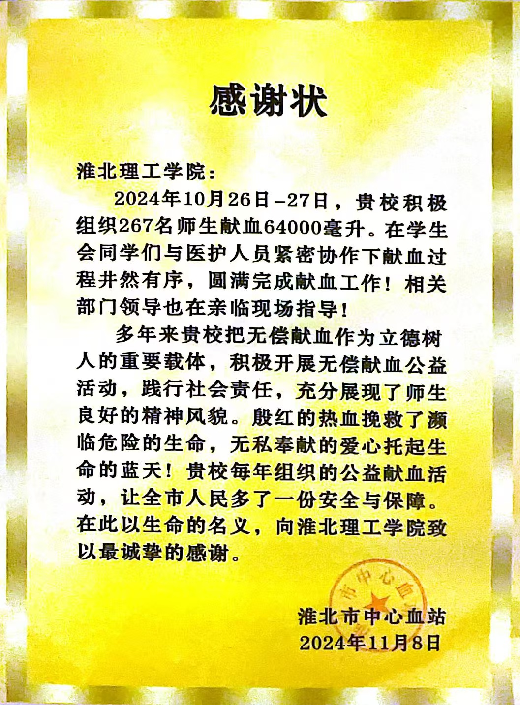 近日,淮北理工学院收到淮北市中心血站“感谢状”,感谢学校一直以来积极组织师生参与无偿献血,用热血共筑生命希望,奉献爱心,为社会播种温暖力量。