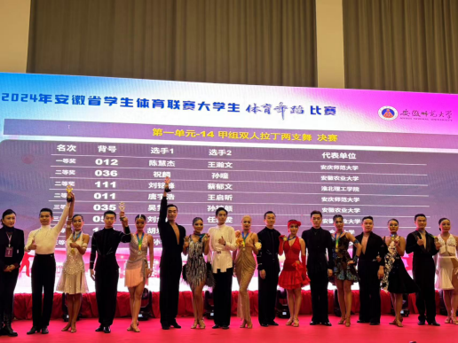 经过一天的激烈角逐,我校代表队取得了骄人的成绩。双人拉丁舞代表队凭借出色的表现荣获第三名,六人组代表队也获得了第八名的好成绩。这些成绩不仅是对我校体育舞蹈代表队辛勤付出的肯定,更是对淮北理工学院体育教育事业的一次有力彰显。