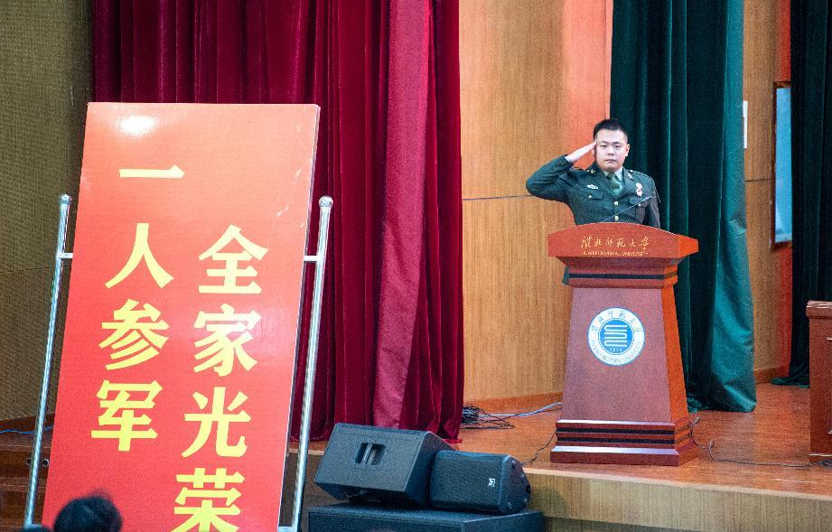 我校周乔洋同学作为退役复学学生代表发言,他表示此次征兵启动仪式,不仅能选拔优秀人才进部队锻炼,更能激发青年学子报效国家、建设祖国的爱国热情;并感谢学校对退役复学学生的关心和厚爱,以及提供了良好的学习环境和更广阔的发展平台。