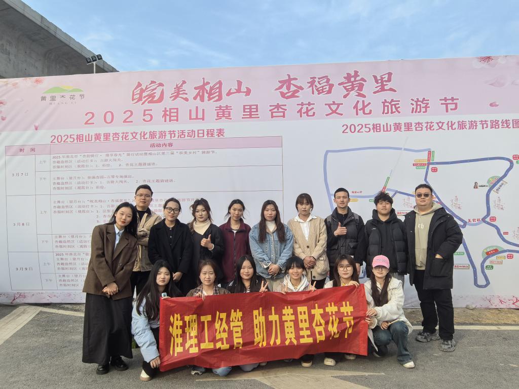 2025年3月8日至9日,淮北理工学院经管学院23级电子商务专业的14名学子应淮北市相山区文化旅游体育局邀请,赴黄里杏花节开展“青春直播助力行”主题实践活动, 以青春之声赋能文旅宣传。学生们以“宣传大使”身份通过实时直播推广杏花节,累计完成超20场次沉浸式文旅推介,达成超5万人次线上曝光,为地方文旅经济注入青春动能。