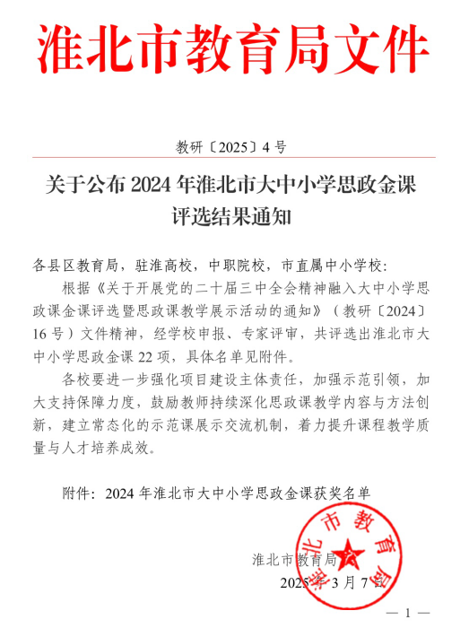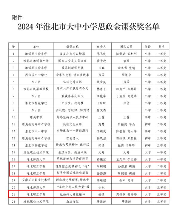 日前,在由淮北市教育局组织开展的党的二十届三中全会精神融入大中小学思政课金课评选暨思政课教学展示活动中,淮北理工学院马克思主义学院孙澄澄、周铜铜、胡倩等三位思政教师凭借创新的教学设计和精彩的课程呈现,在大学组评选中分别荣获二等奖、三等奖,展现了我校思政教师的卓越风采。