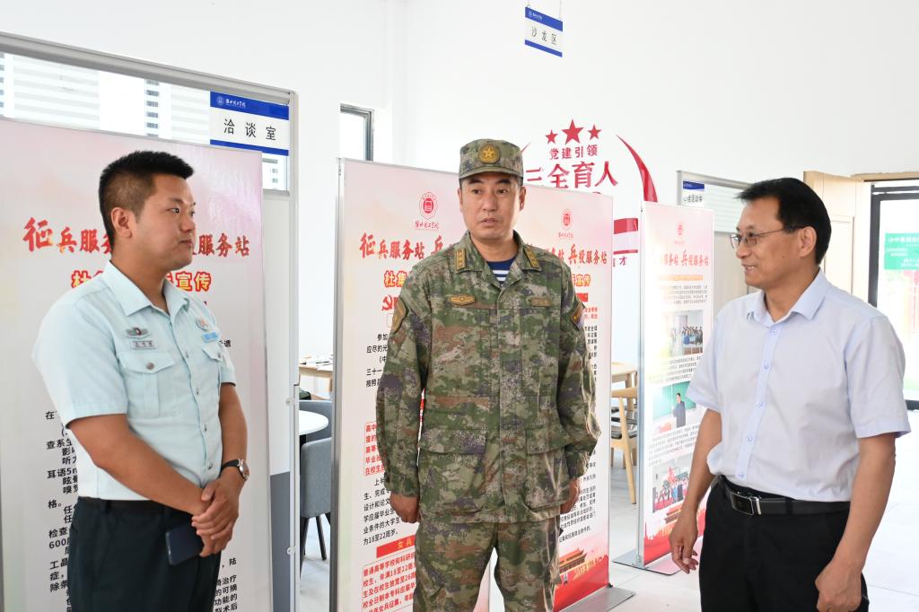宣讲会开始前,孙增响陪同胡后金部长参观了我校“征兵工作站”“兵役服务站”建设情况,并详细介绍了我校2025年上半年应征入伍工作的开展情况。孙增响表示,学校始终高度重视大学生征兵工作,积极开展征兵政策宣传、动员引导、服务保障等工作,确保大学生应征入伍工作扎实有序推进。胡部长对我校征兵工作给予充分肯定,表示将一如既往支持我校征兵工作,进一步加强军地协同,共同推动大学生参军工作高质量发展。