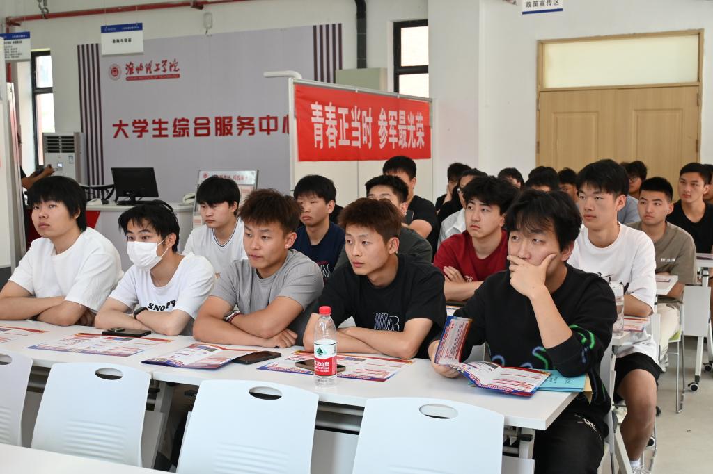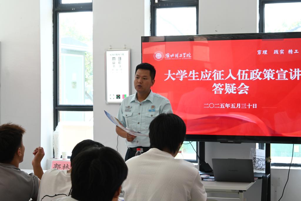 为积极响应国家征兵号召,提升在校大学生对应征入伍政策的了解,增强学生参军报国的责任感和使命感,5月30日上午9点,我校在“征兵工作站”举办2025年大学生应征入伍政策宣讲答疑会。此次宣讲会特别邀请淮北市杜集区人民武装部部长胡后金、参谋张海鹏来校宣讲。学生处处长孙增响陪同参加,各二级学院书记助理、2025届毕业生及其他年级有意愿入伍学生参会。