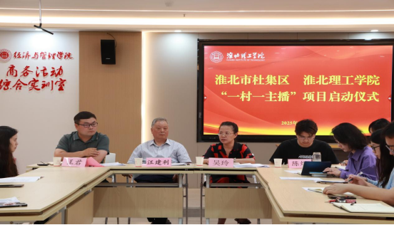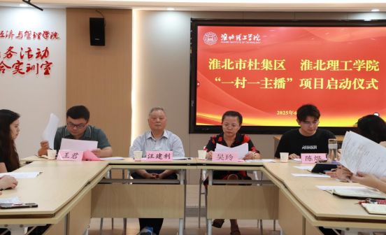 2025年6月4日18时,淮北理工学院与杜集区校地合作共育的“一村一主播”项目启动仪式在学校综合实验楼407室成功举办。杜集区委组织部代表王君、淮北理工学院副校长汪建利、学校特聘讲师陈烨以及四个村承接团队的全体师生共聚一堂,启动仪式由经管学院院长吴玲主持。