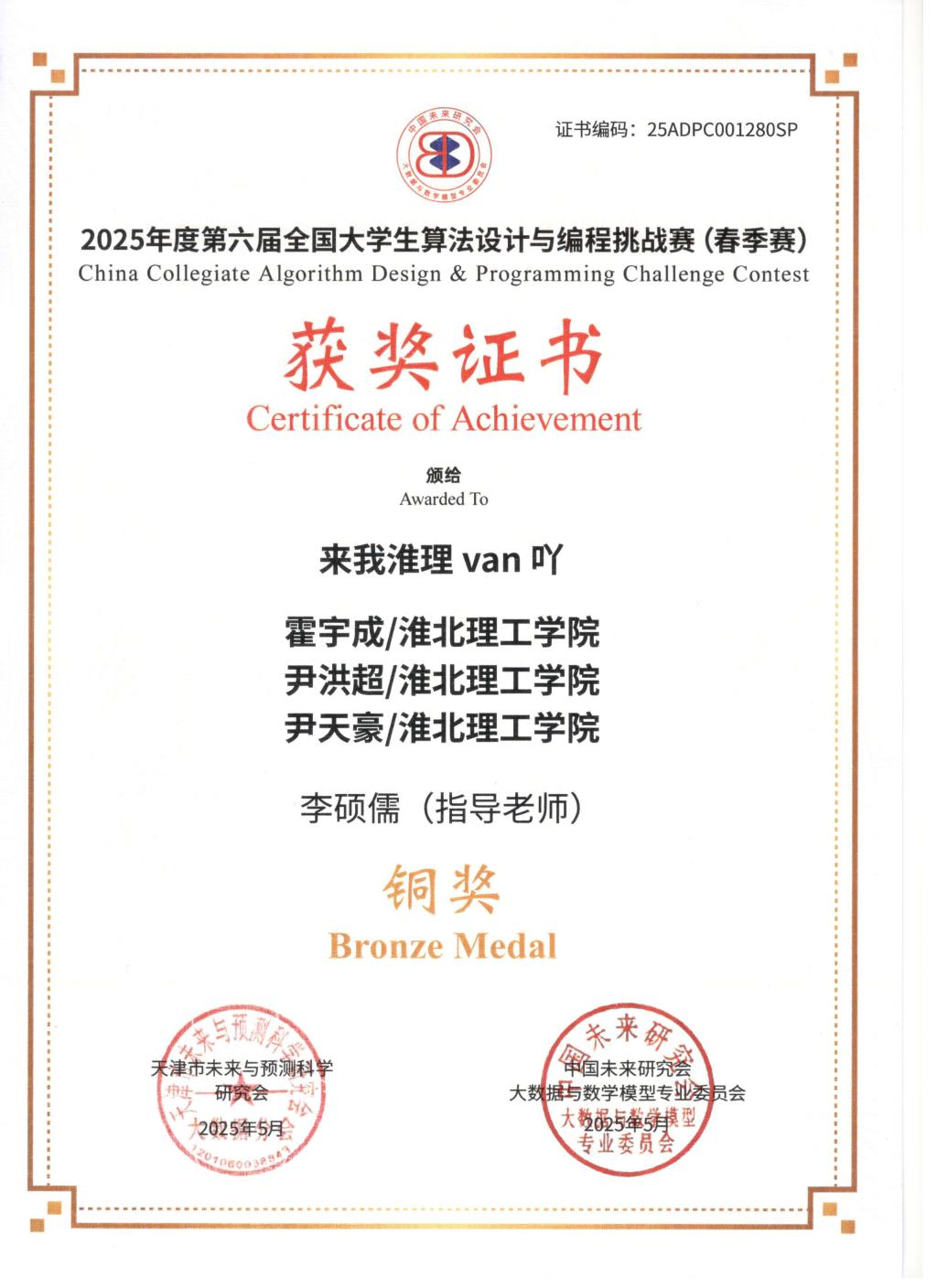 电子与信息工程学院高度重视算法类竞赛对专业人才培养的推动作用,积极组织学生参加算法类。霍宇成等同学在本年全国大学生算法设计与编程挑战赛(春季赛)中获得全国铜奖,尹洪超等同学在安徽省机器人大赛——程序设计赛道获省级二等奖,尹天豪等同学在中国大学生程序设计竞赛全国邀请赛(郑州)获得全国铜奖。