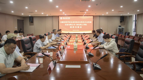 6月26日下午,安徽省科学家企业家协会和淮北合众机械设备有限公司一行来我校就产学研合作开展深入交流。安徽省科学家企业家协会副会长兼淮北办事处主任、安徽省院士专家联合会淮北办事处主任柳忠斌,安徽省科学家企业家协会常务理事、淮北办事处党支部委员、淮北合众机械设备有限公司总经理刘继超,淮北合众机械设备有限公司研发部长刘阳,安徽省科学家企业家协会淮北办事处办公室副主任孟荑,我校党委副书记、校长杨兵,党委副书记、纪委书记、副校长汪建利及有关二级学院、职能部门负责人,专业带头人等专任教师参加座谈。