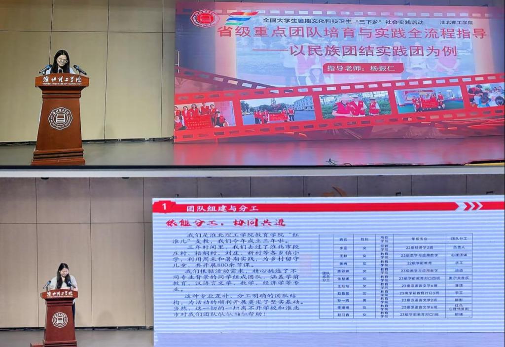 2024年全省优秀团队—淮北理工学院赴合肥市肥东县牌坊回族满族乡民族团结实践团,2024年全国优秀团队—淮北理工学院支教社赴梧桐村“七彩假期 ,筑梦“红淮””支教实践团分别进行了实践汇报和经验分享。