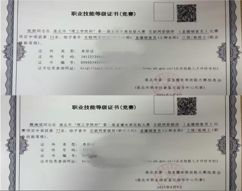 近日,经淮北市职业技能鉴定指导中心严格考核与认定,我校徐畅等165名师生首次批量成功获得“互联网营销师直播销售员三级/高级工”证书,这是对他们专业技能水平的高度认可,也彰显了我校在新兴职业技能人才培养领域的卓越成就。