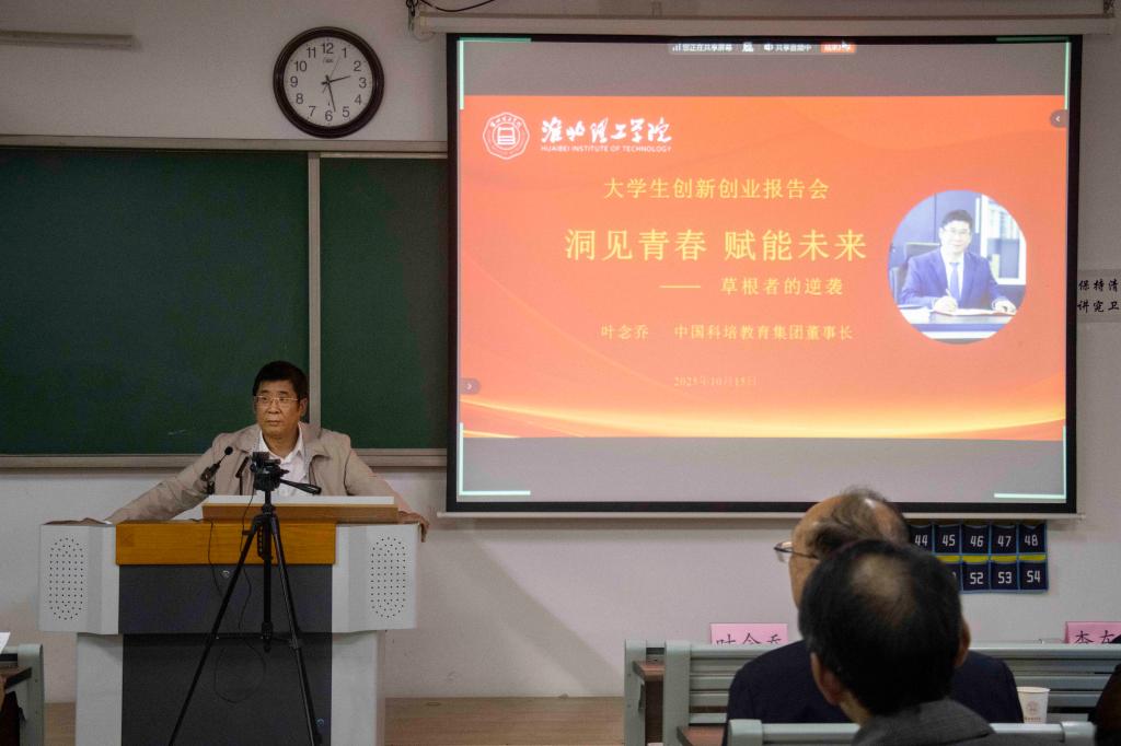 为厚植大学生创新创业意识,10月15日下午,淮北理工学院举办大学生创新创业报告会。中国科培教育集团董事长叶念乔以《洞见青春,赋能未来——草根者的逆袭》为题,为师生们带来一场兼具温度与深度的分享。报告会以腾讯会议的方式进行,中国科培教育集团领导、淮北理工学院校领导、中层以上干部及相关职能部门负责人在主会场一教521参会,同时在2024级、2025级学生所在班级的教室设置84个分会场,7000多名学生同步聆听,共同在奋斗故事中汲取前行力量。