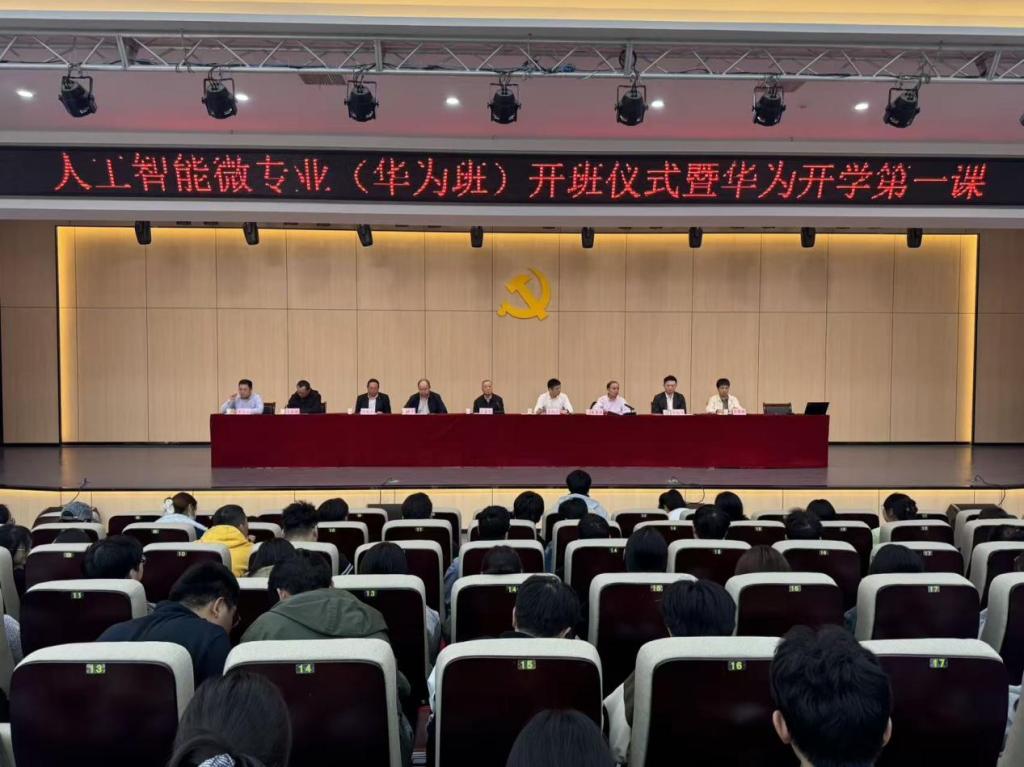2025年10月15日下午,淮北理工学院人工智能微专业(华为班)开班仪式暨华为开学第一课在学校报告厅举行。华为安徽政企副总经理、淮北理工学院-华为ICT现代产业学院副院长李雨涛,华为安徽宿州淮北政企业务总经理陈勤舟等企业嘉宾,淮北理工学院副校长汪建利教授、教务处处长陈国平教授、电子与信息工程学院院长朱昌杰教授等校领导出席活动。人工智能微专业(华为班)学员、卓越工程师班学生、2025级部分新生及电子与信息工程学院教职工共400 余人参会,仪式由朱昌杰主持。