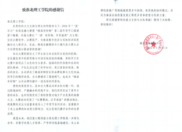 1月13日,濉溪县融媒体中心向我校发来感谢信,对我校寒假“返家乡”社会实践团队在“‘溪’引力”电商直播大赛暨“濉溪有好物”第二届年货节活动中的突出表现给予充分肯定,高度赞扬我校学子在服务地方数字经济发展、推动实体经济与新业态融合方面所作出的积极贡献。