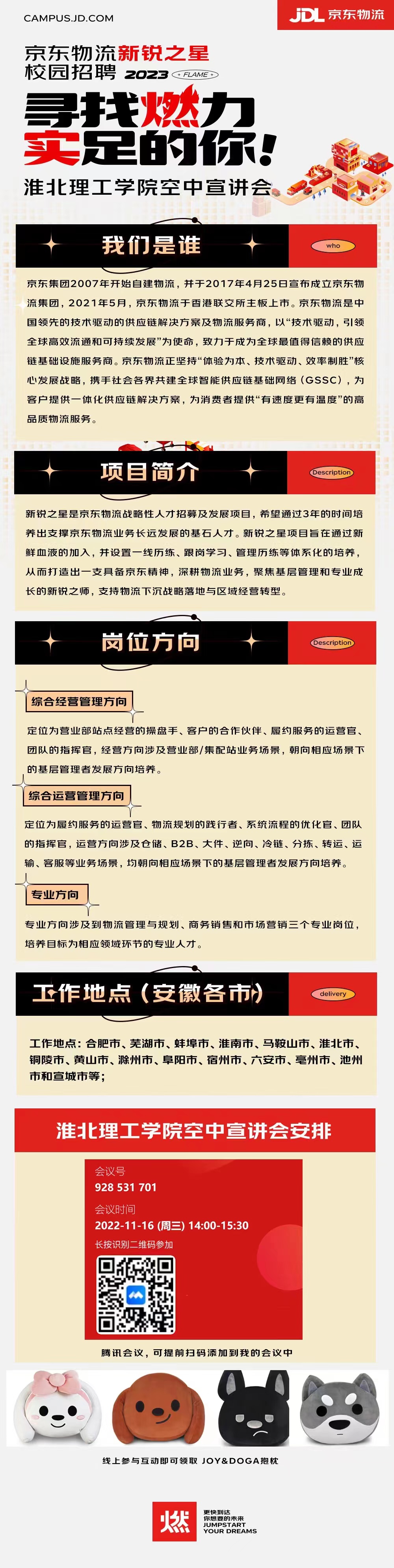 经协商,我校定于11月16日联合京东物流共同举办2023新锐之星淮北理工学院空中宣讲会。