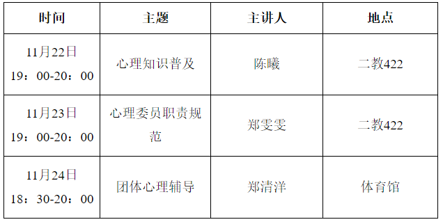1.基础知识讲座。主要以讲授的方式进行,内容聚焦于心理委员和心理协会骨干的岗位职责和行为规范。基于工作的专业要求,为心理委员和心理协会骨干提供专业支持与指导。