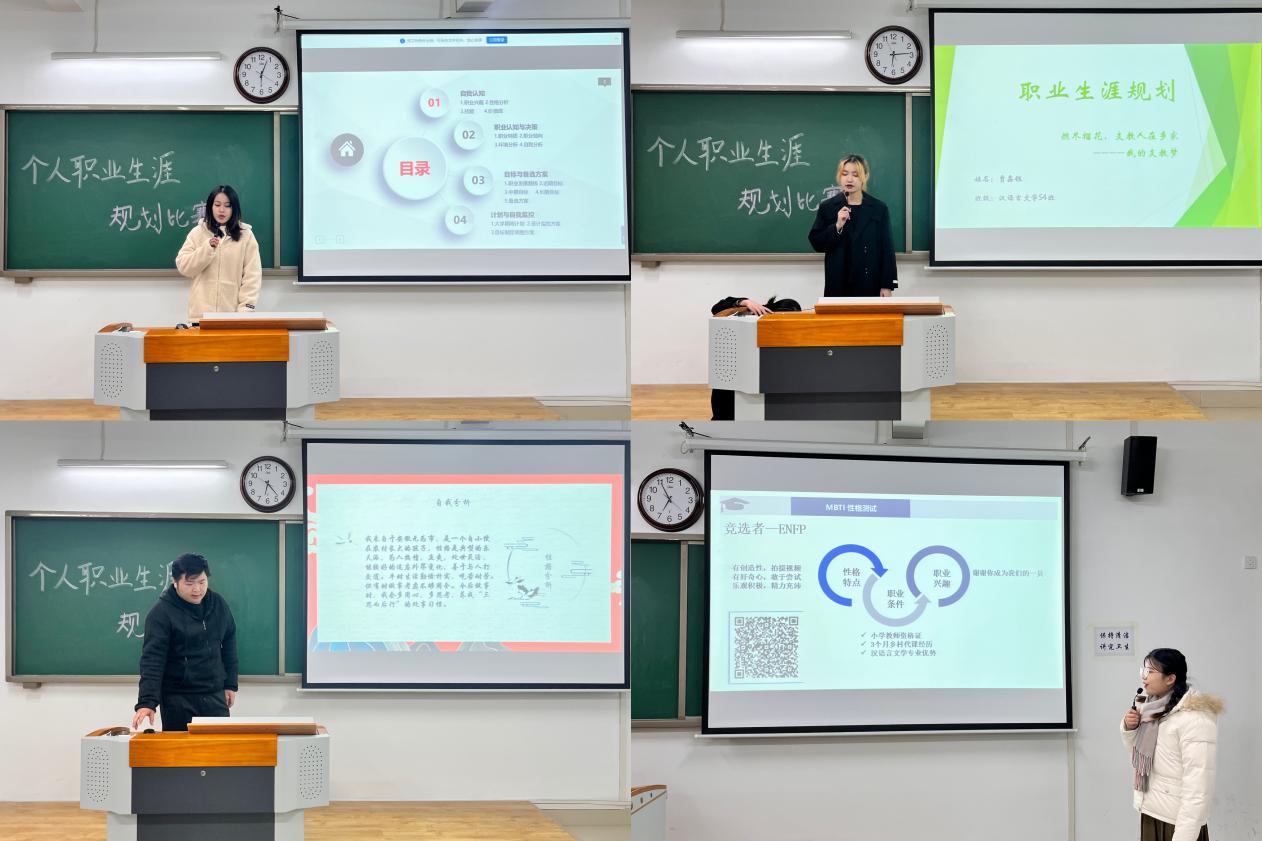 为落实立德树人根本任务,发挥“以赛促学、以赛促教”的积极作用,进一步深化大学生职业生涯规划和创新创业教育,提升大学生职业生涯规划能力,为未来职业发展奠定基础。教育学院自10月中旬以来在全体2022级专升本学生中开展了“职业生涯规划大赛”活动,活动得到了同学们的热情支持和广泛参与,参赛项目分职业规划类和创新创意类两类,经班级初赛后,最终共28个项目进入本次院级决赛。决赛于12月2日晚在1号教学楼413、414、415、416教室分组举行,各比赛小组评委由辅导员老师担任。