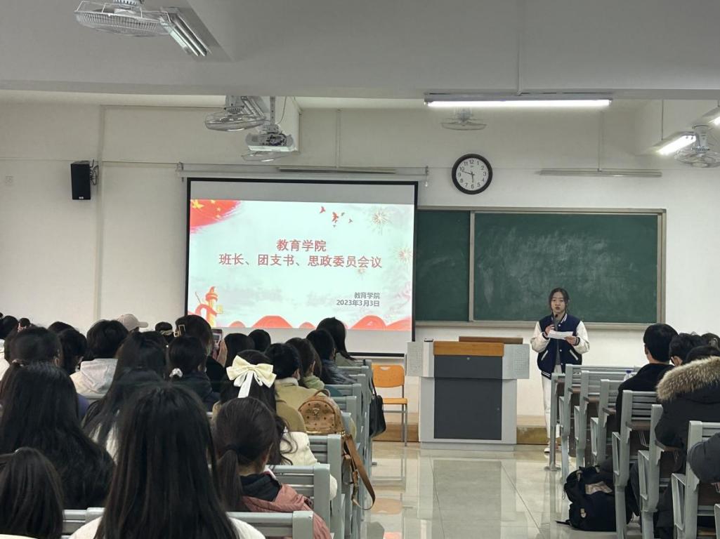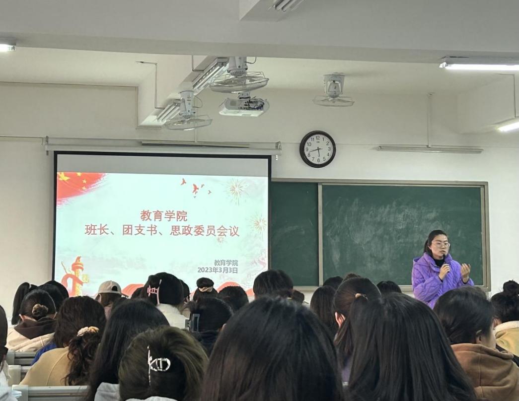 为提高我院学生干部的工作能力和个人素养,加强学生与老师之间的交流,更好地开展今后的学生工作,3月3日下午,教育学院于1教420召开新学期第一次班长、团支书、思政委员工作会议,会议由我院团总支书记黄莹莹老师主持,孟向红院长、辅导员老师陈慧慧、许海涛及2022级49个班班长、团支书和思政委员参加。