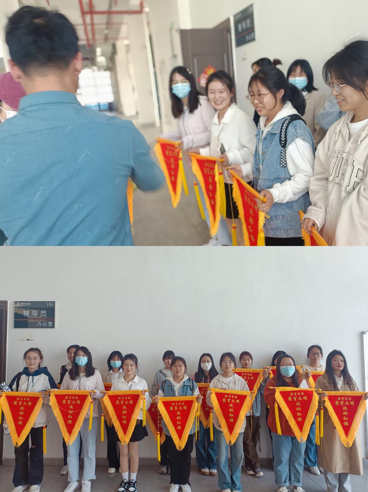 在此次检查评选中,共有14间宿舍获得“寝室文明流动红旗”荣誉称号,学院团委副书记许海涛和辅导员郭鸿鑫老师为获奖寝室颁奖。许海涛老师鼓励获得寝室再接再厉,努力创造更加优雅的学习生活环境,并以实际行动带动周围同学为营造“平安、尚学、文明、和谐”的寝室环境共同努力。