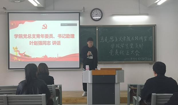 4月7日中午,马克思主义学院与经济管理学院学生支部于2教422召开二十大主题学习暨党员转正大会,讨论预备党员刘恩惠、闫瑞同志转正事宜。学院党总支书记助理、团总支书记叶赵强同志特邀参会,经济学学生支部书记员禹辛、青年委员王绎程、管理学学生支部书记石园园、青年委员张雨停及学生支部83名党员参会。大会由学生党支部组织委员刘良晨主持。
