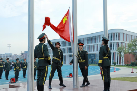 清晨,操场上的师生代表早早集合完毕,队列整齐。升国旗仪式正式开始后,国旗护卫队队员迈着整齐划一、铿锵有力的步伐,护卫着五星红旗入场。伴随着庄严的国歌声,鲜艳的五星红旗迎着朝阳冉冉升起。
