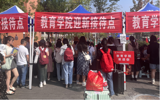 从车站至校门口到报到处,再到宿舍内,随处可见教育学院迎新老师和志愿者们的身影。宿舍楼下的引导小组按楼层仔细对应核算分发门卡;负责秩序引导、方向指引的小组耐心解答新生的各种问题并介绍校园概况和注意事项;负责行李搬运的小组主动帮忙为新生和家长分担行李。