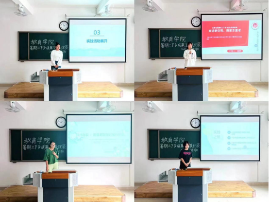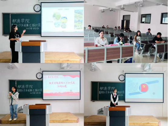 教育学院暑期开展三下乡社会实践活动,旨在锻炼学生社会实践能力,9月27日下午,教育学院于2号教学楼415教室、416教室、417教室举办三下乡成果汇报比赛,由23级辅导员老师担任评委,各实践团队同学参加。