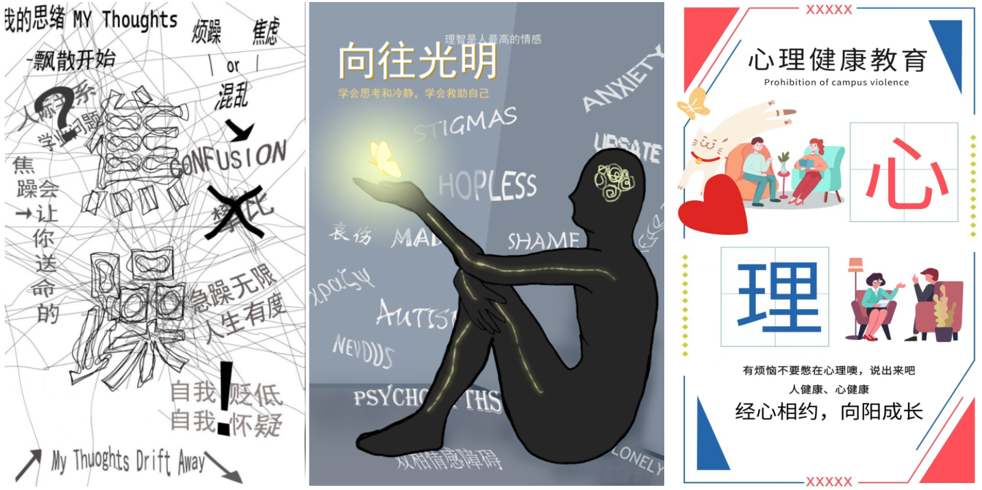 本次主题海报设计的作品,大力宣传大学生心理健康的重要性,同时增强了同学们美育方面的知识、也提升了同学们的软件技能以及手绘能力。其中部分海报大胆加入了不同元素构成,给观众带来强烈的视觉冲击和美感。