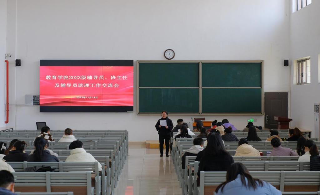 为做好学生的思想政治教育、学习和生活管理,确保学院学生思想政治教育、学生日常管理、学风建设等方面工作的有序推进。11月14日中午,教育学院在1号教学楼121教室组织召开了“2023级辅导员、班主任及辅导员助理工作交流会议”。会议由学院分管副书记孟向红主持,2023级各辅导员、班主任及辅导员助理参加。